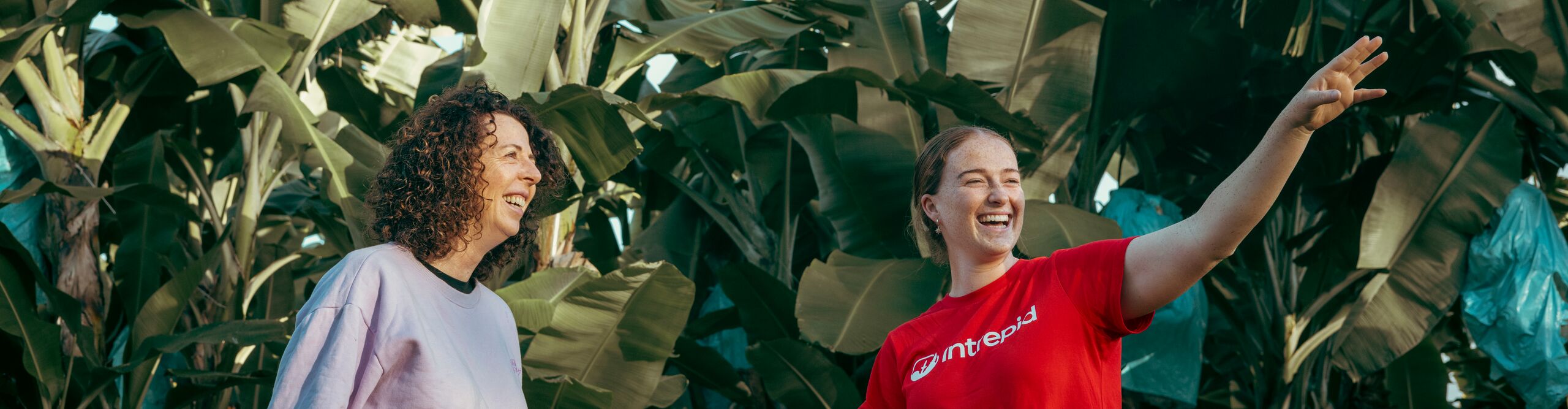 An Intrepid leader in red t-shirt gestures and smiles with a traveller in front of banana trees