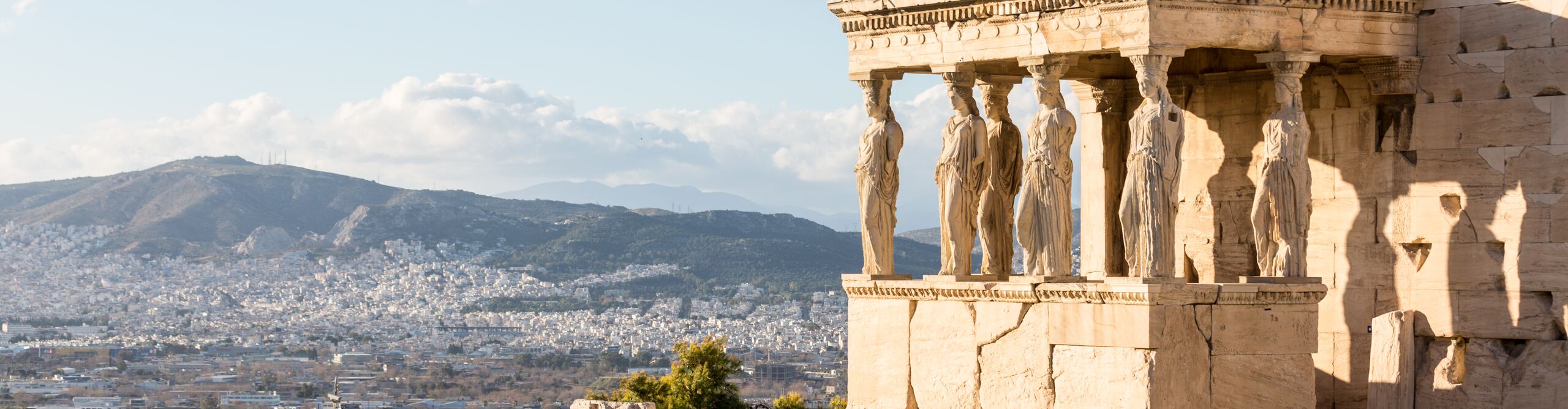 The Porch of the Caryatids in Athens set against a backdrop of the city