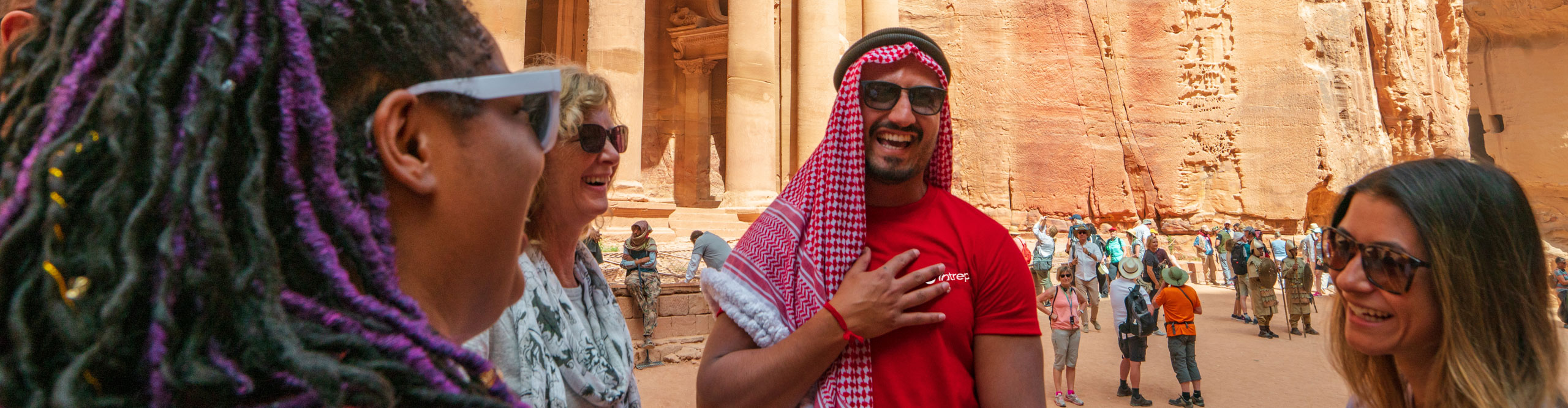 Travellers with their tour guide looking at point at the gates of Petra, on a clear sunny day