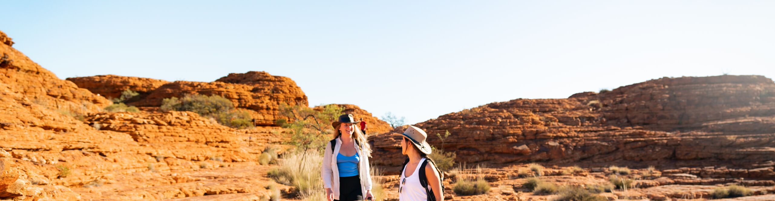 Two women smile while walking through a national park in the sun in the Northern Territory