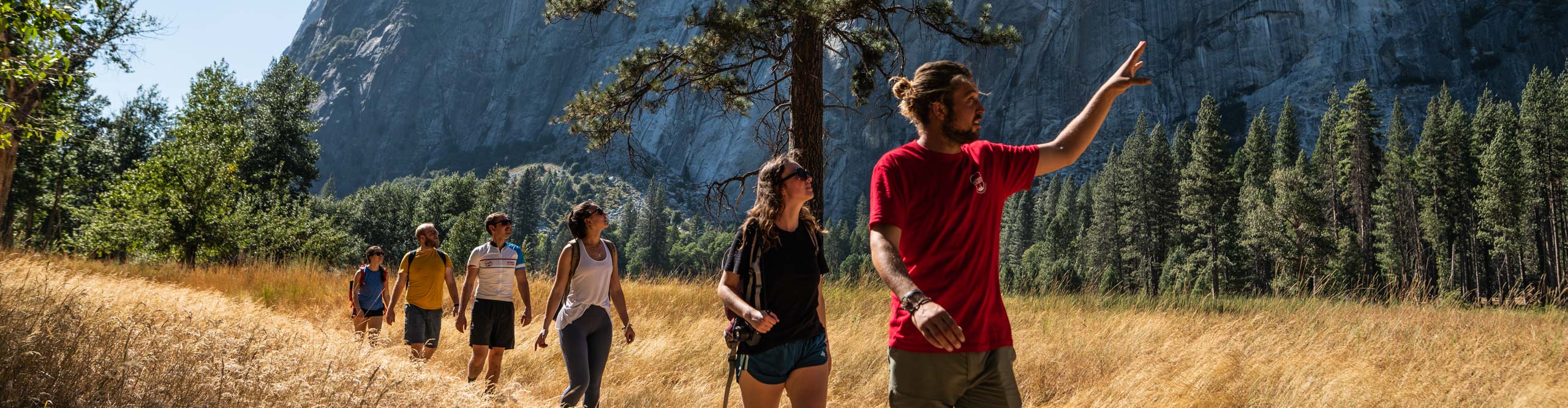 Tour guide and group walking though the long grass next to the mountain, Yosemite National Park, USA